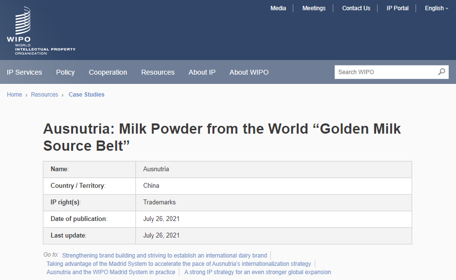 近日,澳优入选世界知识产权组织(WIPO)全球案例,并获得世界知识产权组织(WIPO)官网刊文介绍相关经验及成就。